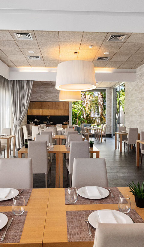 En el Restaurante Carabí podrá disfrutar de unas agradables vistas al jardín e incluso gozar de las noches de verano cenando en la terraza, entre plantas exóticas y buena compañía.
